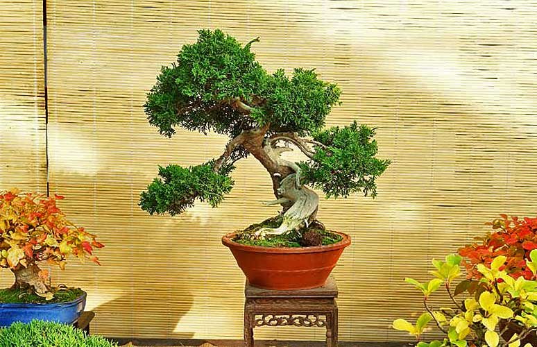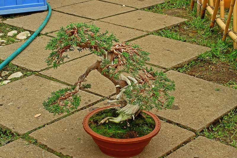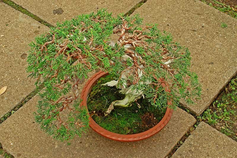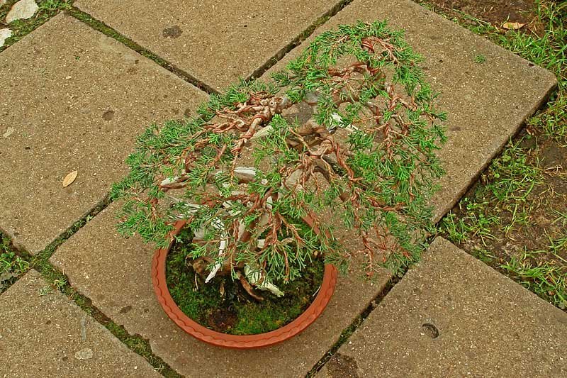 Представленный бонсай можжевельник имеет явно переросшие ветки. Предварительно делаем стрижку, а затем проводим формирование веточек с применением проволоки. Проволока позволяет нам придать веточкам нужное направление.