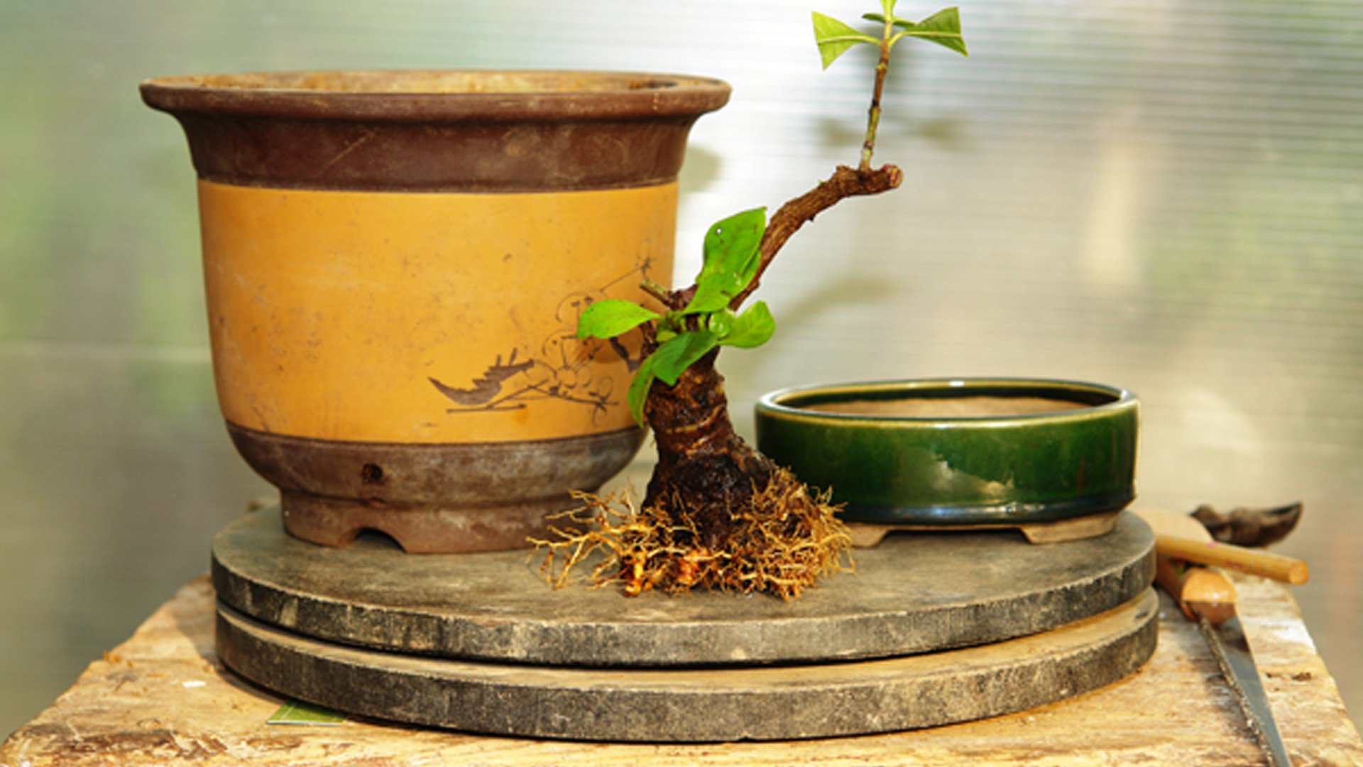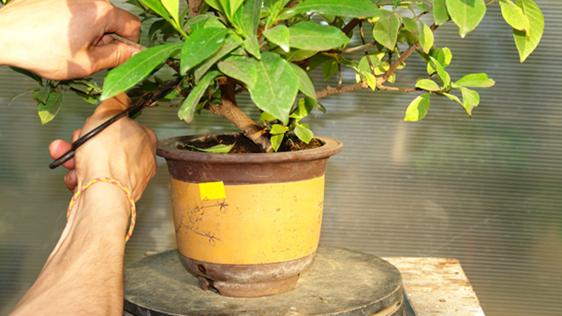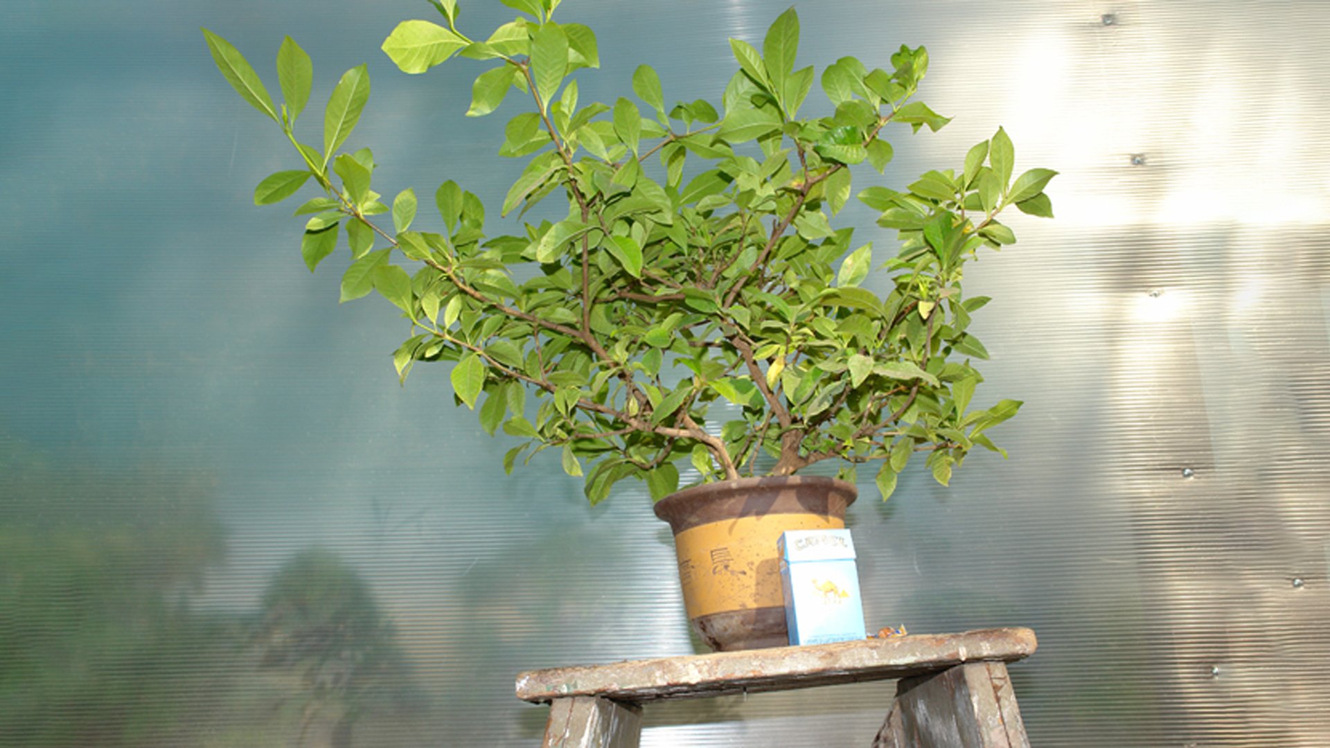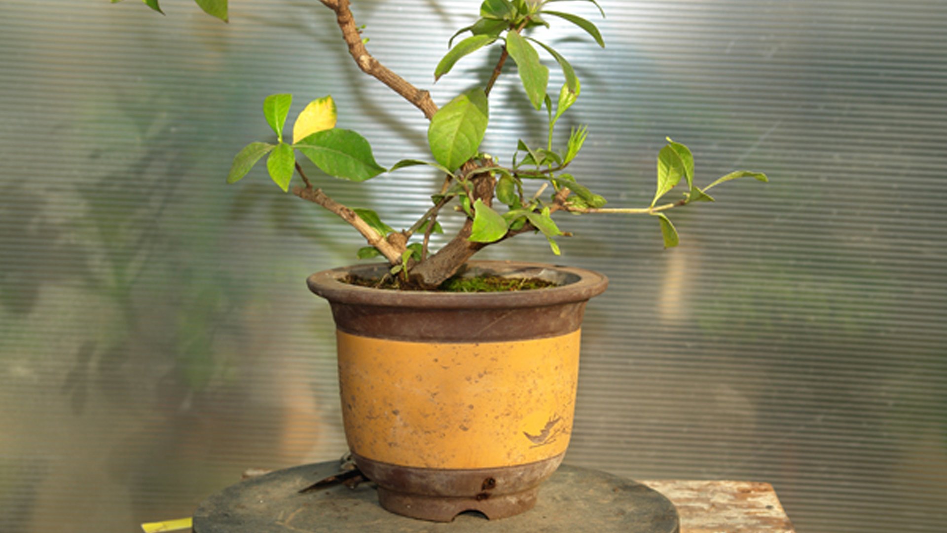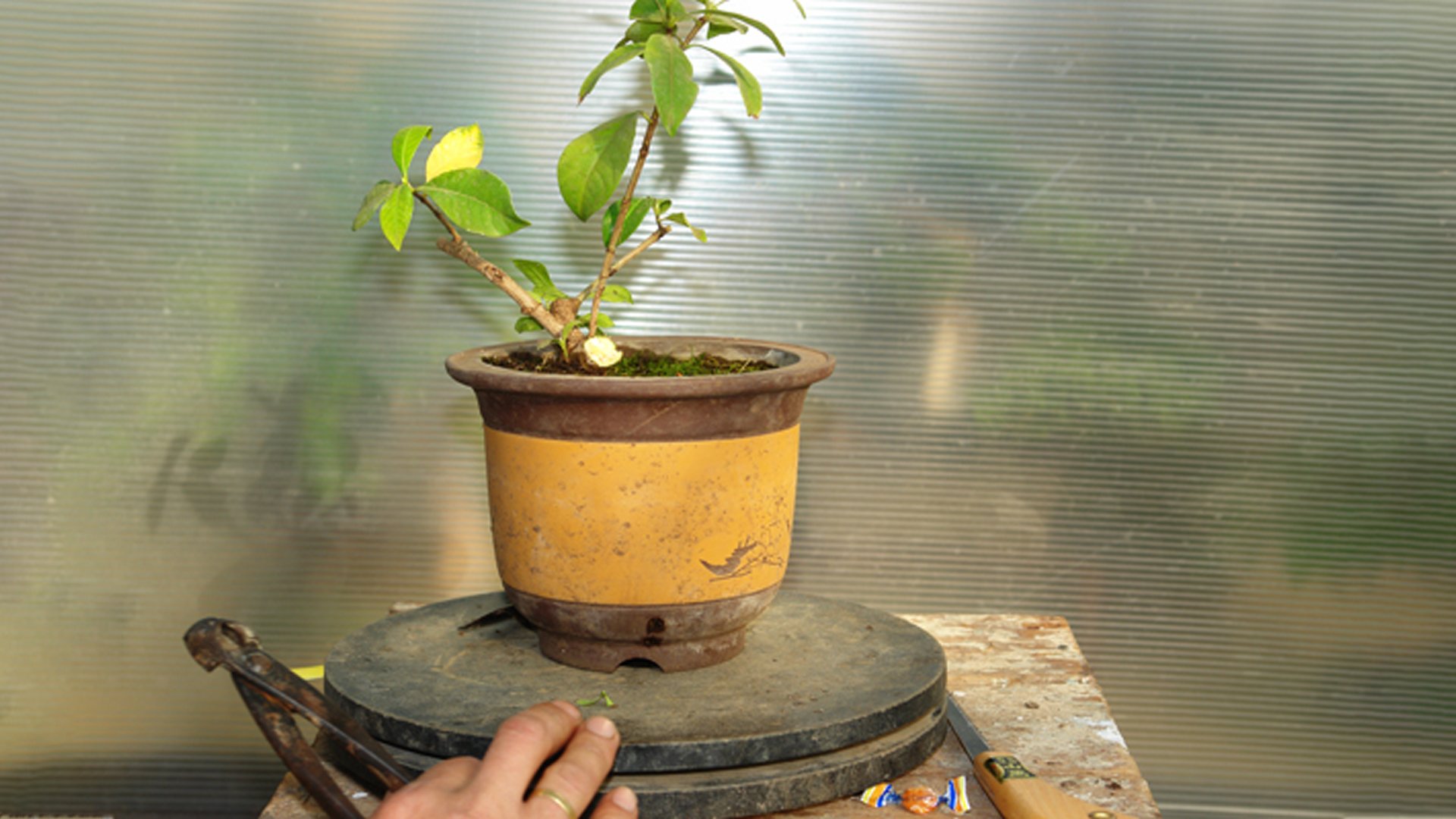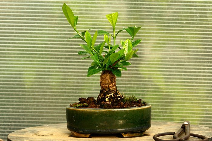 Гардения жасминовидная в рабочем горшке. Растение выращивалось из годовалого черенка в течении 8 лет. Производилась неоднократная пересадка в больший контейнер и обрезка ветвей за прошедший период времени. Достигнув нужной толщины ствола у основания 4 см определяем будущую высоту бонсай до 20 см.