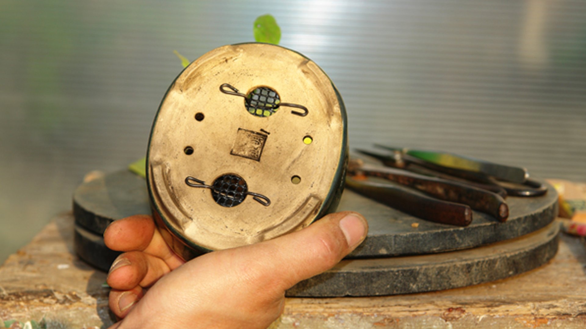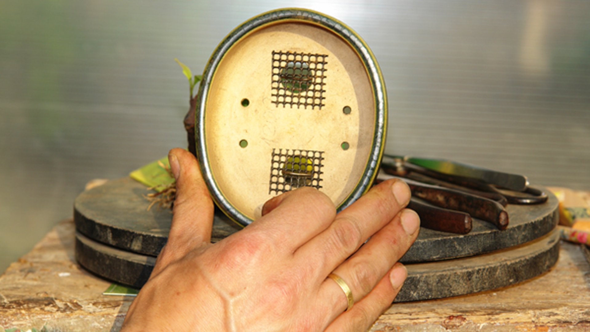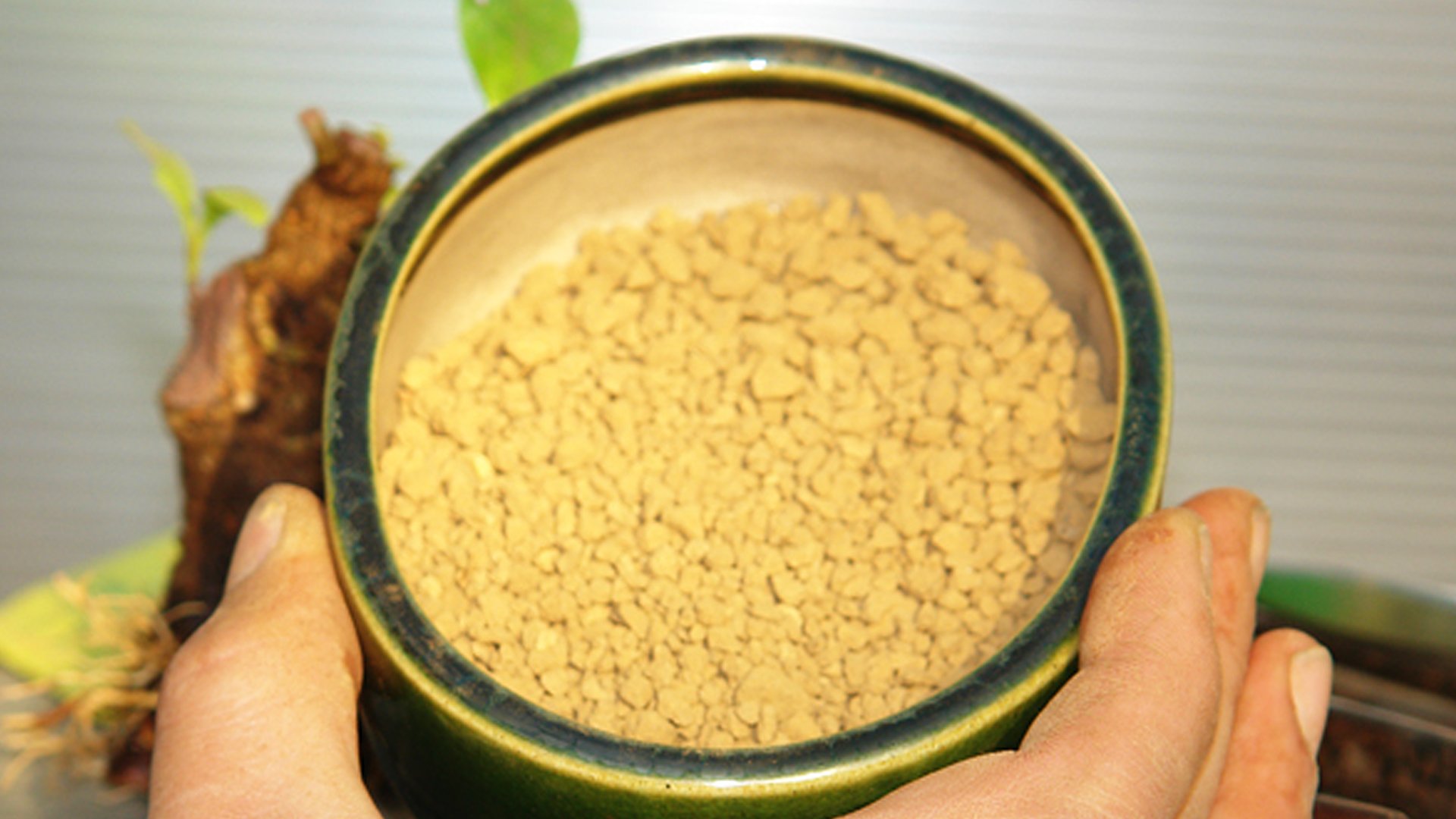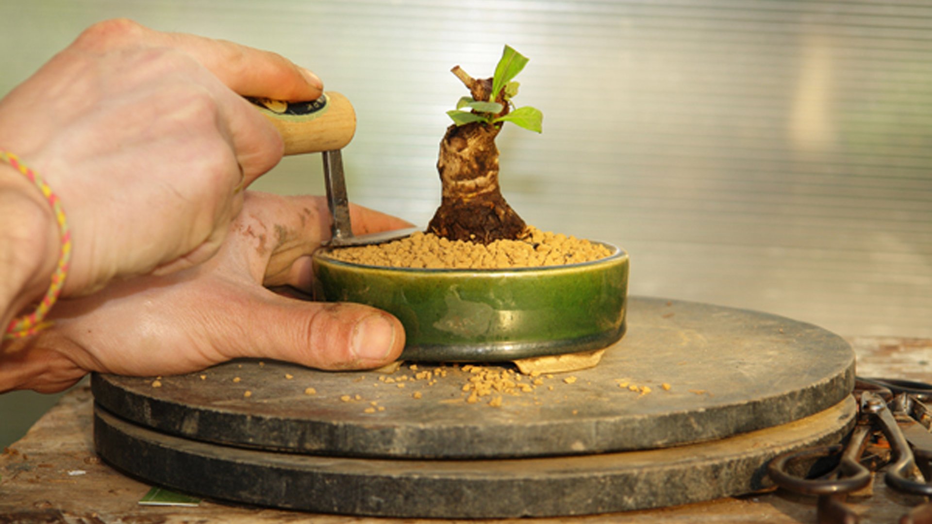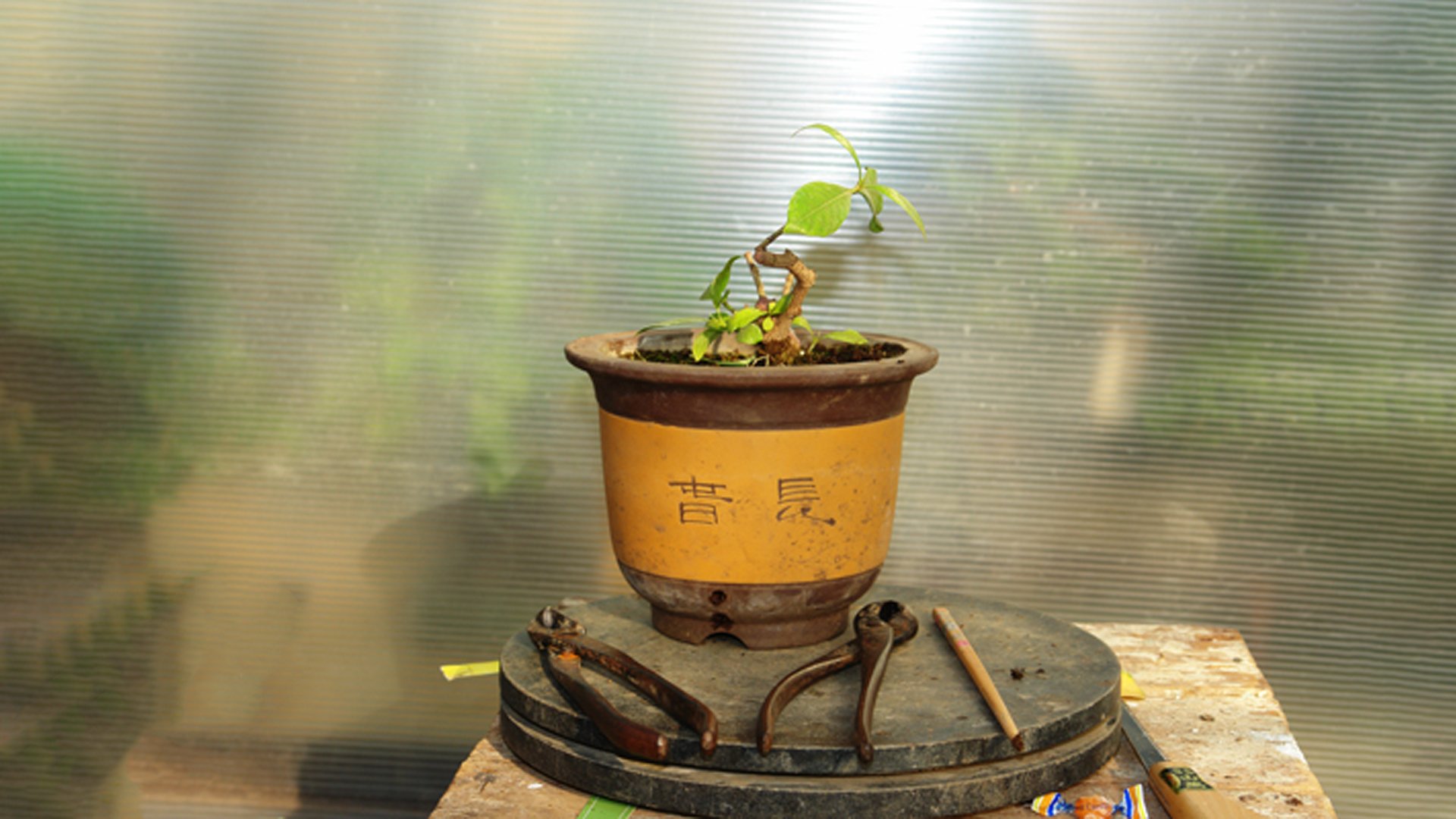 Гардения жасминовидная в рабочем горшке. Растение выращивалось из годовалого черенка в течении 8 лет. Производилась неоднократная пересадка в больший контейнер и обрезка ветвей за прошедший период времени. Достигнув нужной толщины ствола у основания 4 см определяем будущую высоту бонсай до 20 см.