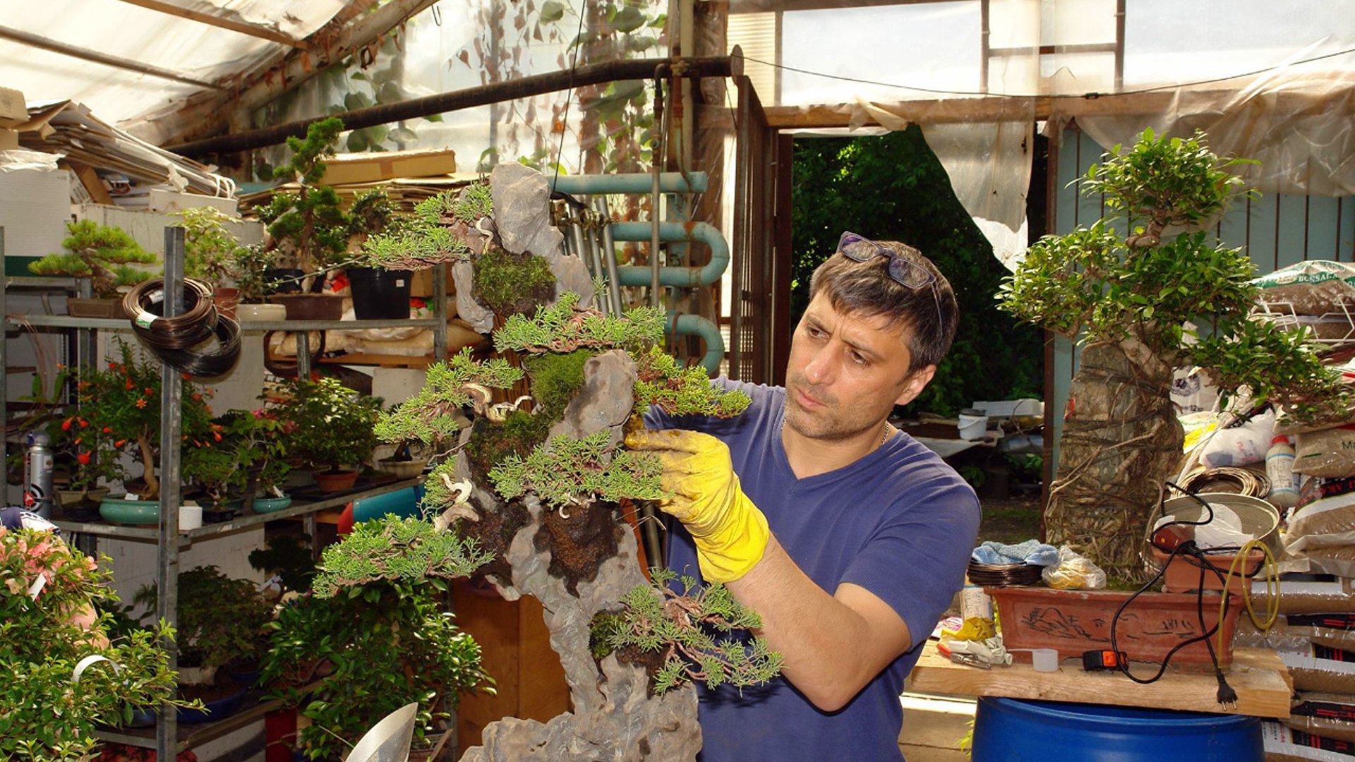 Исходный материал для будущей композиции. Подготовка камня, на котором будет располагаться композиция. Форма готова, устанавливаем её на постамент и протягиваем проволоку для того чтобы в последствии закрепить наши бонсай. Валерий Пител за работой :) Процесс создания поэтапно. Финальный результат.