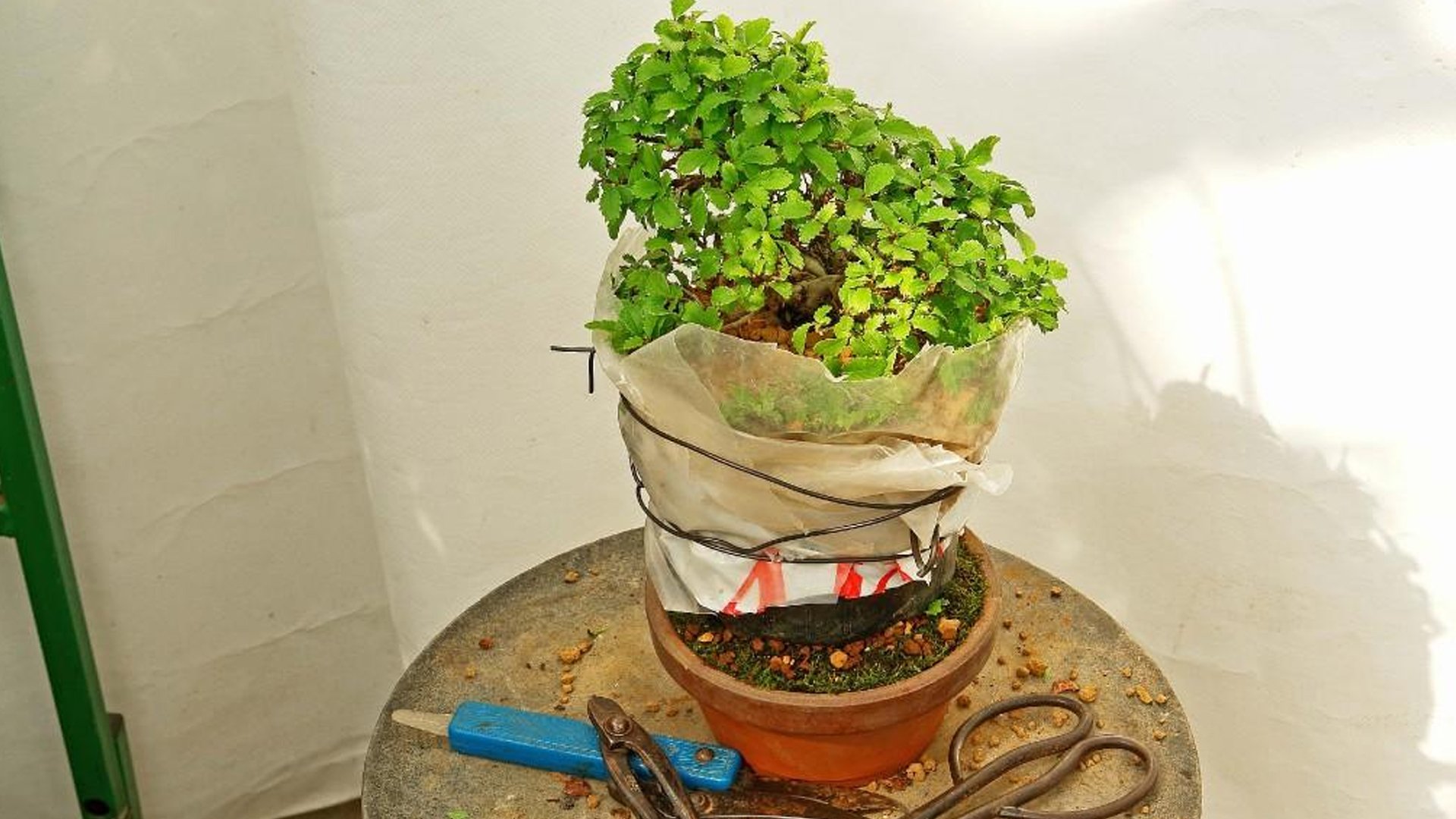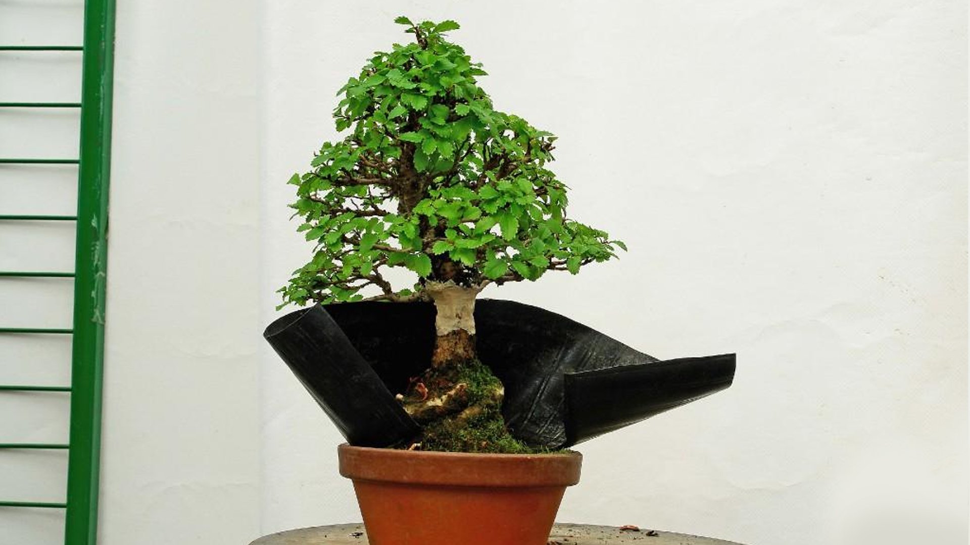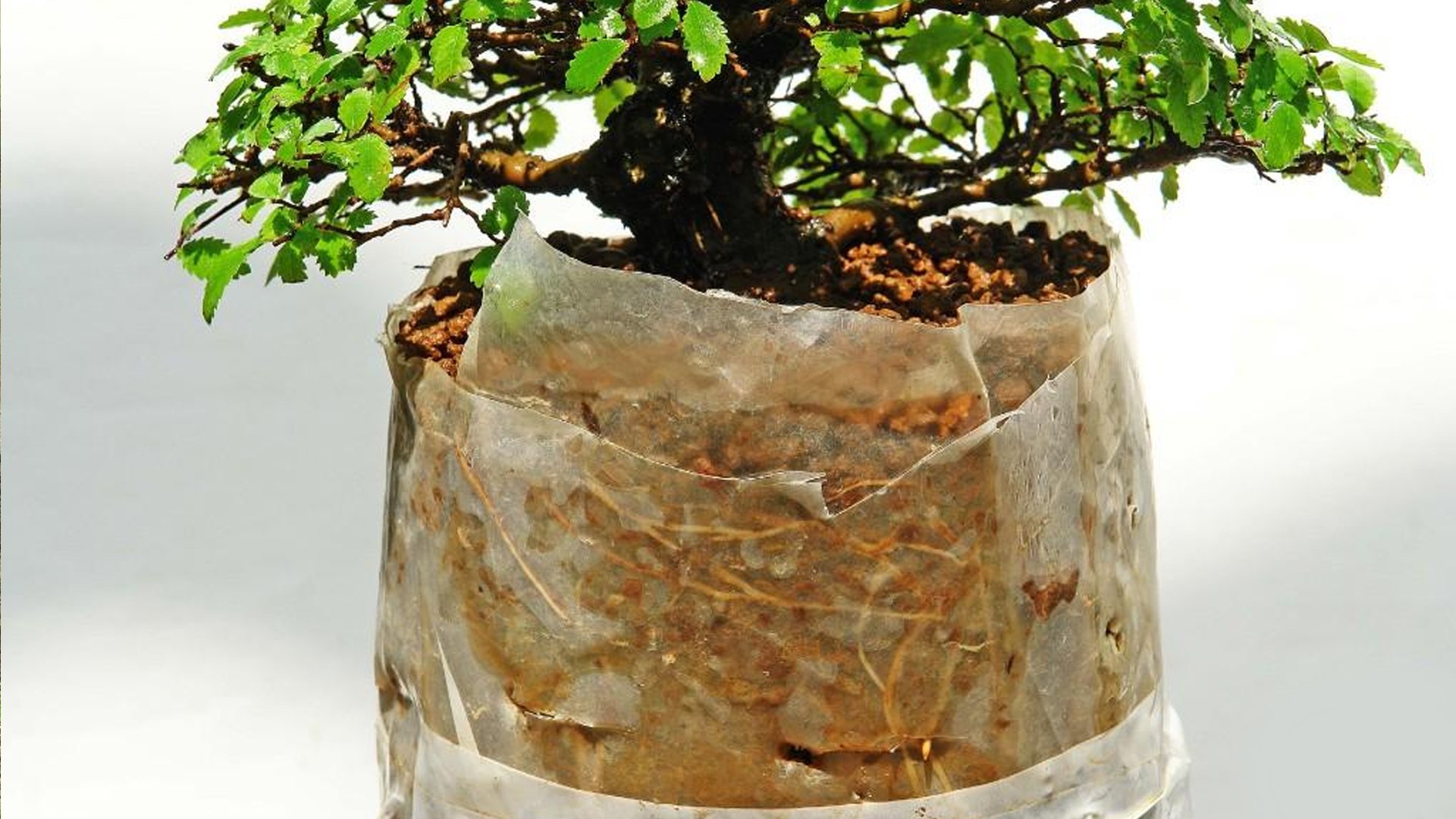 - На место наложения проволоки надевается полиэтиленовый горшок с землей (состав - акадамацути и речной песок в равной пропорции). Земля может быть обмотана болотным мхом, как это делается в варианте смешанного леса.