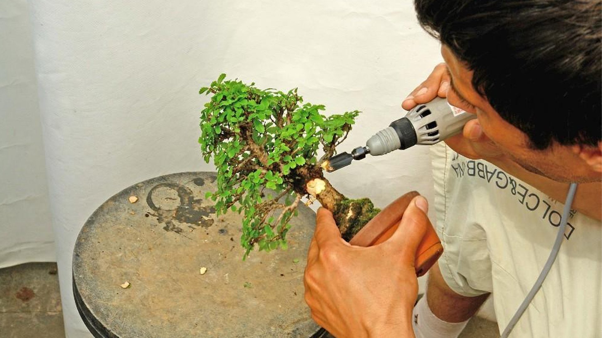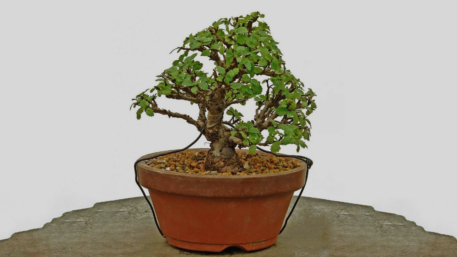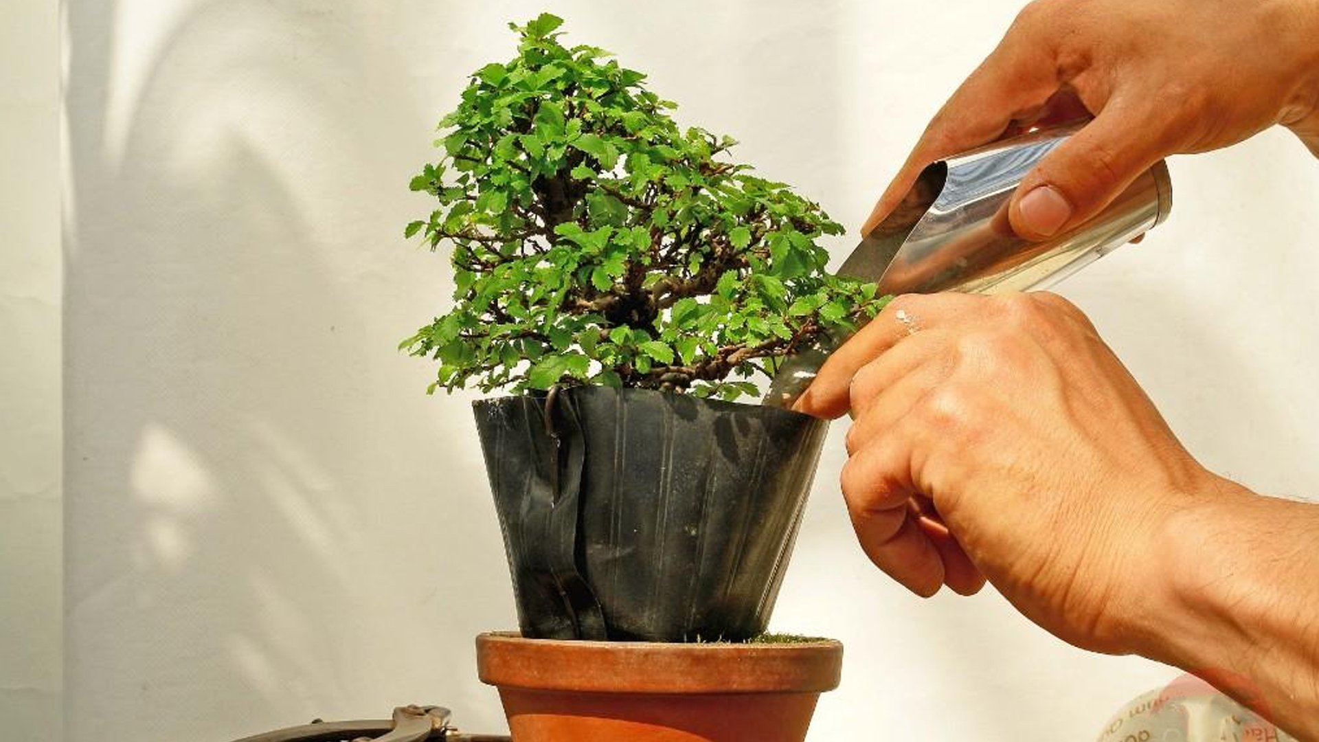 - На место наложения проволоки надевается полиэтиленовый горшок с землей (состав - акадамацути и речной песок в равной пропорции). Земля может быть обмотана болотным мхом, как это делается в варианте смешанного леса.