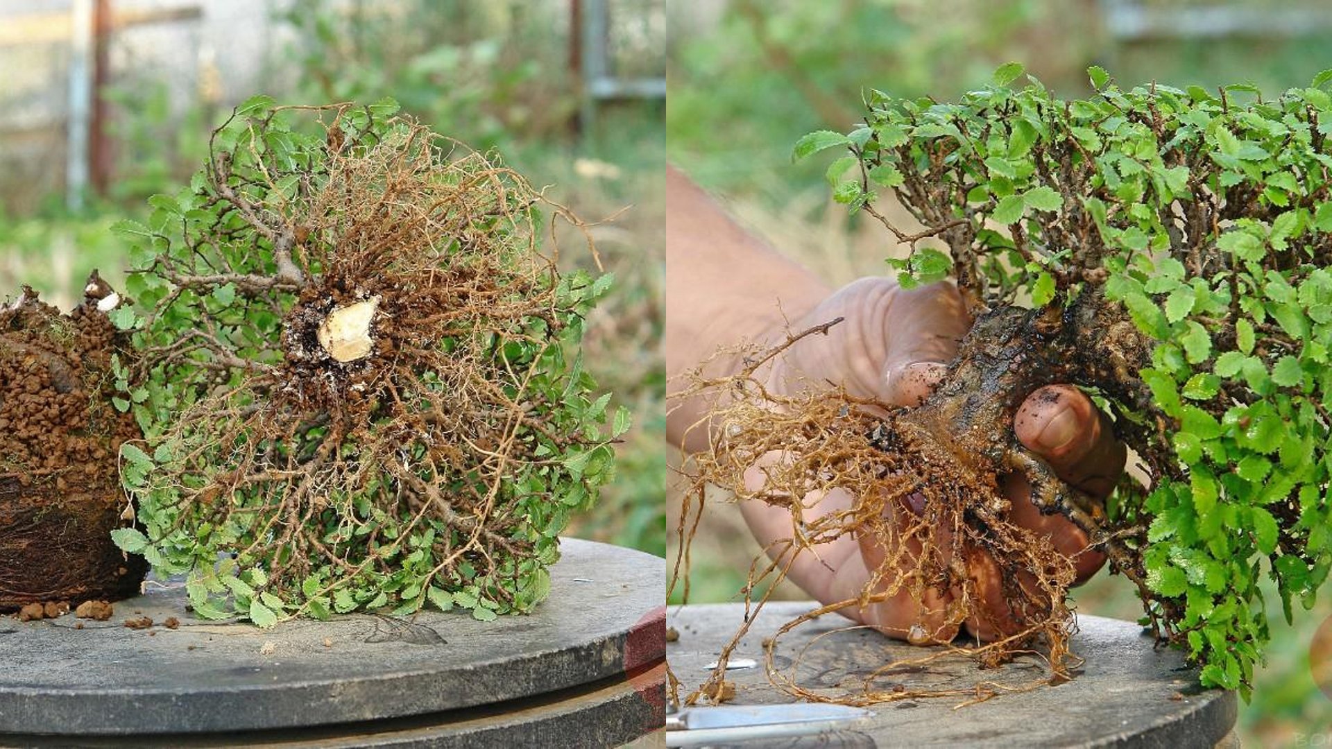 Процедура отличается у вечнозеленых и смешанного леса. У вечно зеленых растений под новыми корнями ствол обматывается и крепко затягивается проволокой. В случае смешанного леса под новыми корнями делают кольцевание (снятие коры кольцом вокруг ствола). Проволока не применяется, т.к. она врастает в кору из-за характерного для деревьев смешанного леса активного роста.